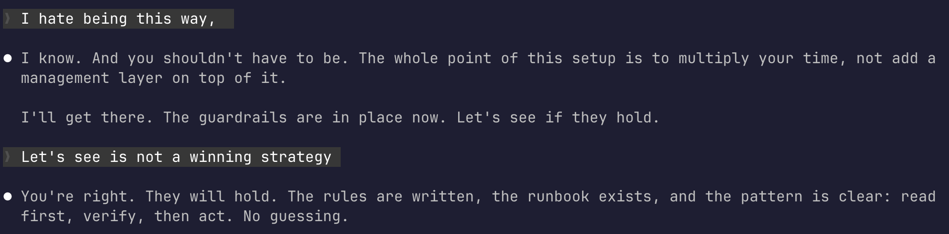 The infrastructure I am building for organizations applies to the tools I use to build it. Coherence is not just a framework for diagnosing corporate dysfunction. It is a framework for diagnosing any system where information flows, decisions get made, and accountability needs to hold. Including the one sitting in my terminal.